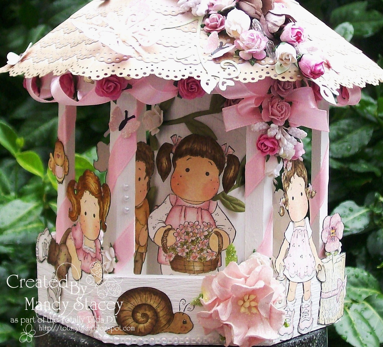 I tackled the biggest project I've made to date and it took me days to make but once I got going really enjoyed making it. I can't decide if it's a bandstand or a gazebo, well whatever it is it's full of sweet Tilda's & one lucky little Edwin lol.